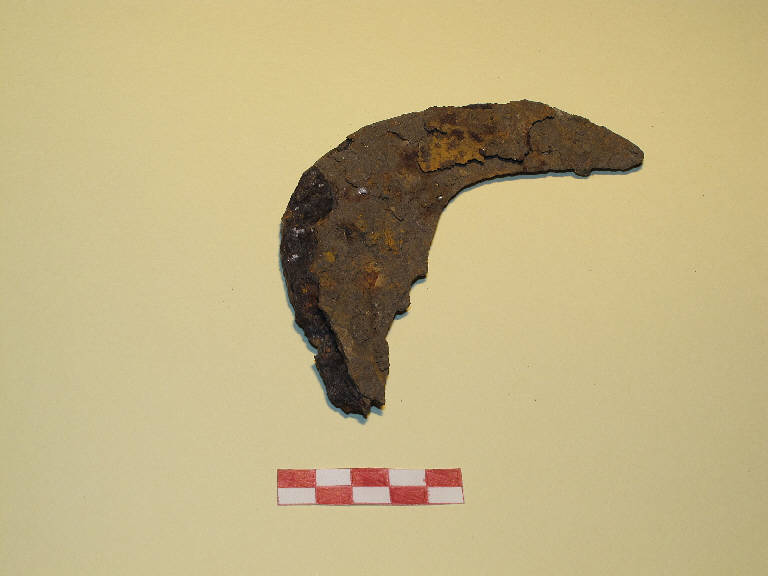Falcetto frammentario in ferro, con lama decrescente ricurva a due terzi della lunghezza. Superficie molto corrosa.