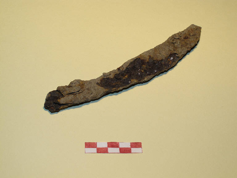 Coltello frammentario in ferro con lama a dorso ricurvo. Superficie corrosa e incrostata.