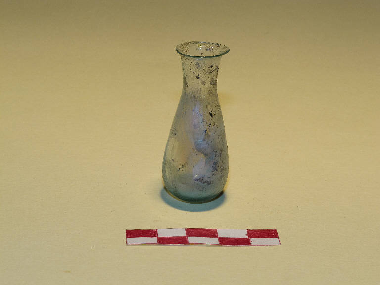 Balsamario in vetro tipo Isings 8. Incolore, trasparente. Lacunoso di part dell'orlo.