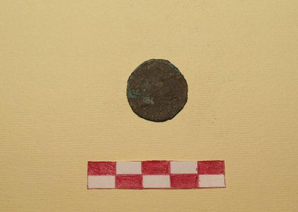 Moneta romana in bronzo (Antoniniano?). \nD/ busto di imperatore\nR/ figura stante che regge figurina nella mano destra una piccola figura alata.