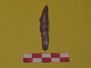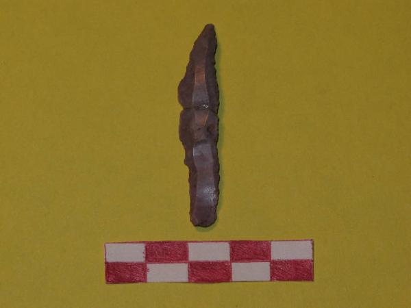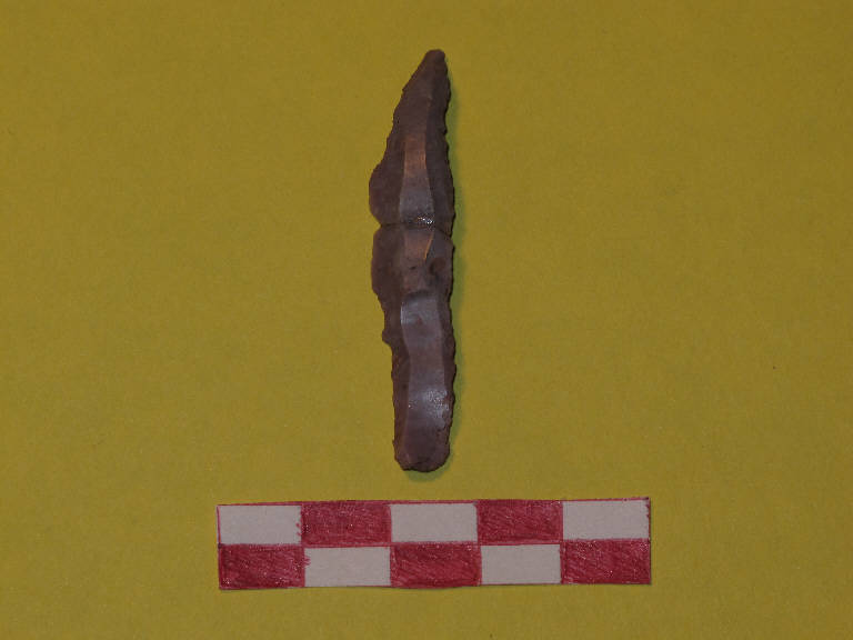 Becco-raschiatotio su lama a sezione trapezoidale in selce di colore grigio-rosato. Raschiatoio laterale destro a ritocco continuo marginale. Ritocco ventrale destro distale e prossimale.