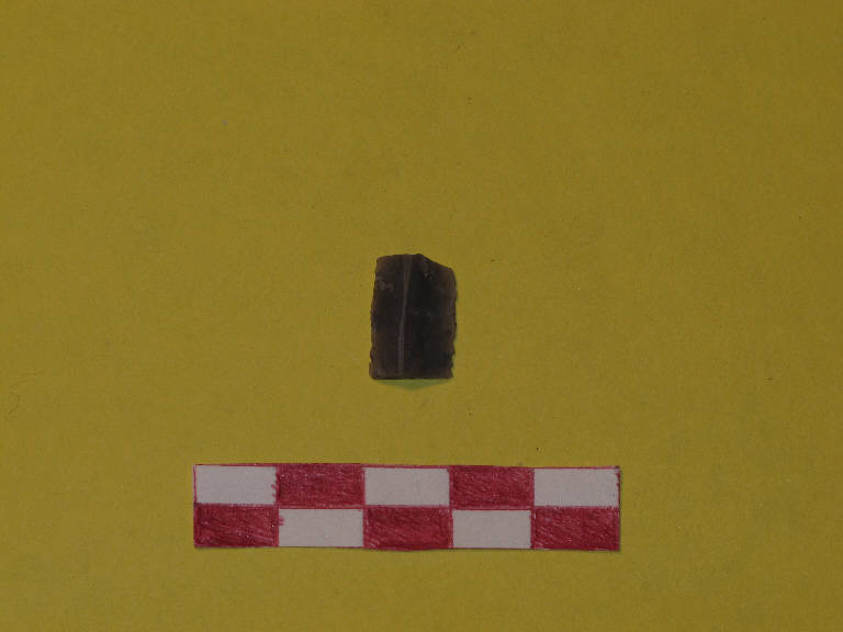 Lamella in selce di colore grigio, a sezione triangolare.