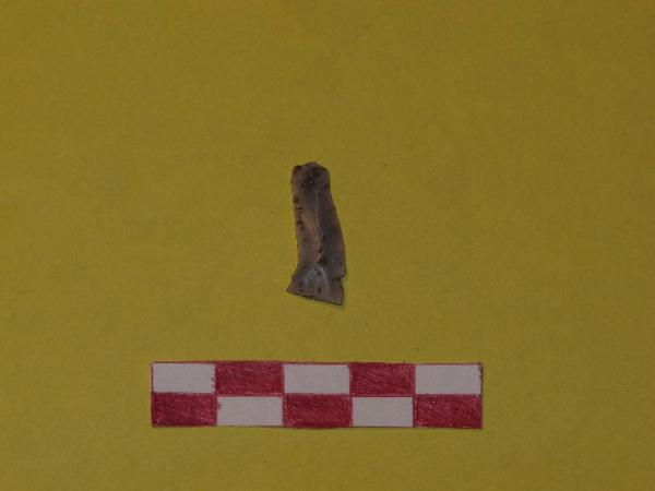 Lamella di selce di colore grigio chiaro, a sezione triangolare.