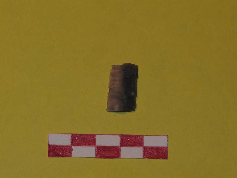 Lamella in selce di colore grigio scuro, a sezione triangolare, trapezoidale.