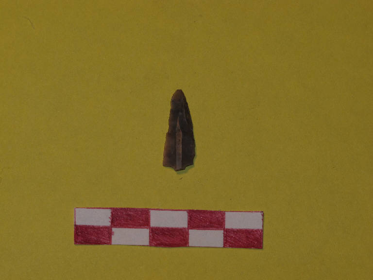 Lamella in selce di colore grigio, a sezione trapezoidali. I margini si restringono verso una delle estremità a formare una punta.