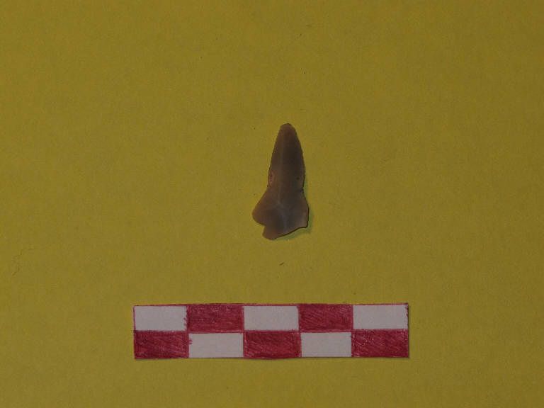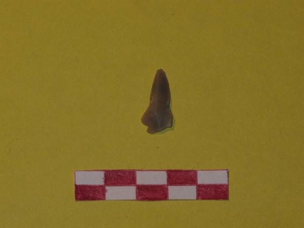 Lamella in selce di colore beige, a sezione triangolare. I margini si restringono verso l'estremità distale a formare una punta.