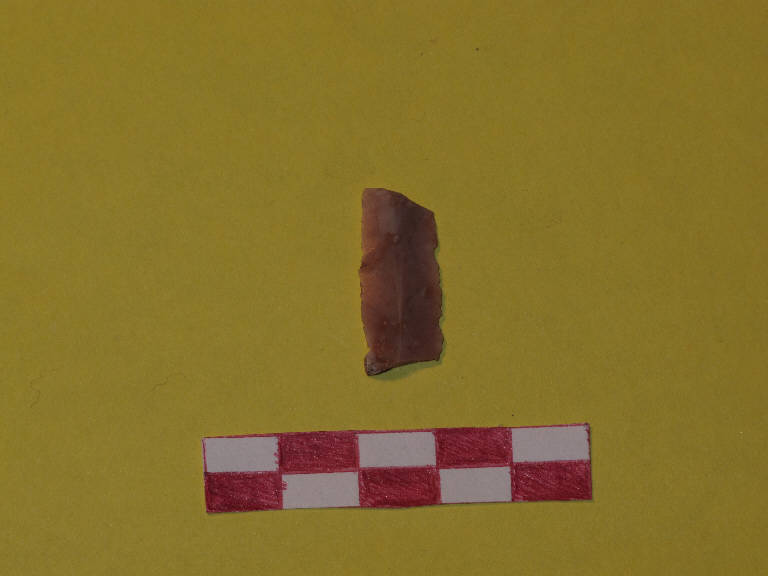 Lamella in selce di colore marrone rosato, a sezione triangolare.