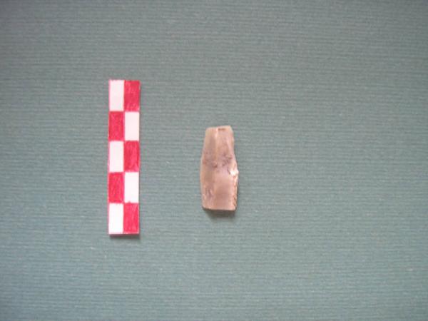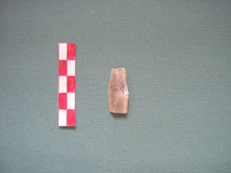 Lama in selce di colore grigio, con floculi bianchi, a sezione trapezoidale.
