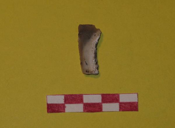 Raschiatoio laterale su lama, in selce di colore bianco e grigio, a sezione trapezoidale irregolare. Ritocco marginale laterale sinistro inverso. Integro. Cortice in corrispondenza del margine destro