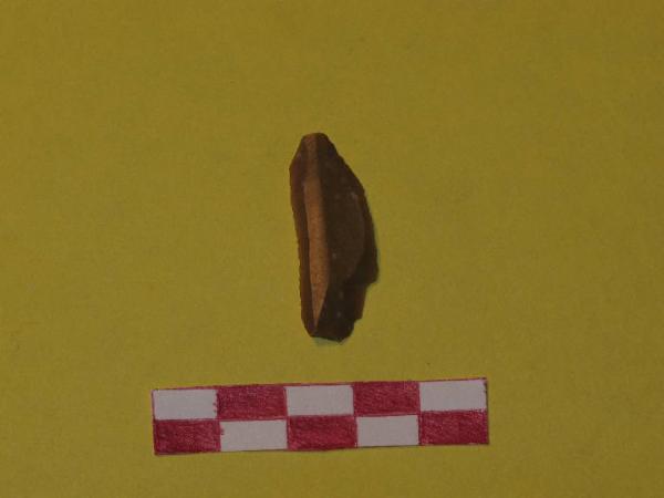 Lamella in selce di colore giallo ocra, a sezione poligonale a base piana. Uno dei margini ha profilo curvilineo; i margini sono convergenti a una delle estremità. Integro.