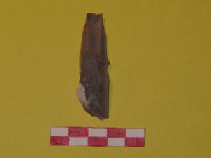 Lama in selce di colore beige, a sezione trapezoidale. Resti di cortice sul margine destro verso l'estremità distale.
