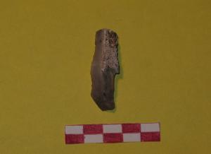 Grattatoio frontale su lama a sezione triangolare, in selce di colore grigio. Resti di cortice sul lato sinistro prossimale. Integro.
