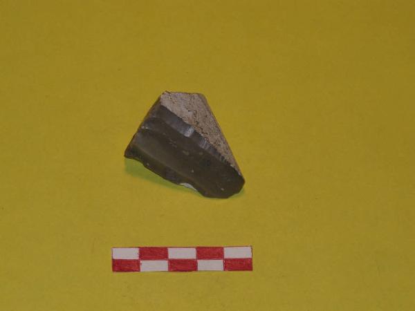 Nucleo per lamelle, in selce di colore giallo ocra, di forma piramidale, con due superfici ricoperte di cortice. Integro.