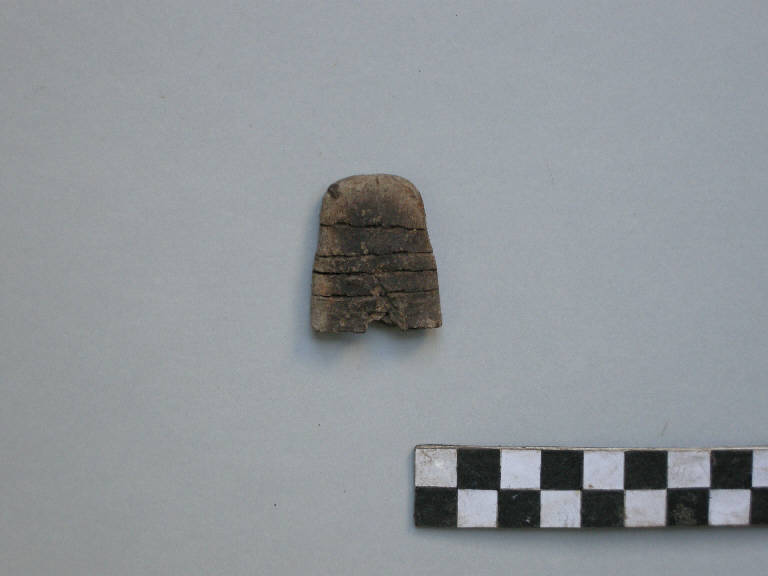 Oggetto, prodotto in ceramica d'impasto granulosa color bruno-nerastro, avente forma trapezoidale con gli spigoli superiori arrotondati. Presenta 4 righe trasversali alla lunghezza del pezzo, incise solo su una faccia, ognuna delle quali è occupata da tre gruppi coppelline tonde raggruppate fra di loro, per un totale di 9 segni per ogni riga. Lungo la linea di frattura del pezzo si intravede una quinta riga.