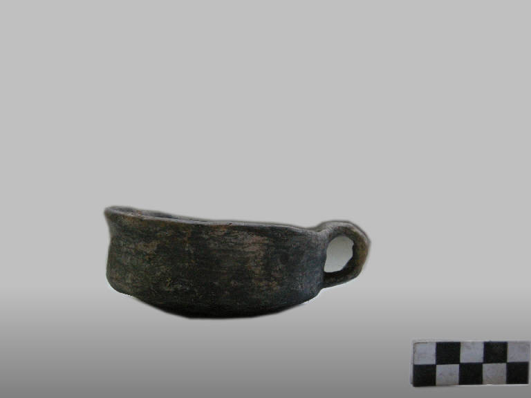 Ciotola mono ansata , prodotta con ceramica d'impasto bruno-nera, con superfici esterne ingubbiate a stecca, a base convessa di fattura irregolare, con pareti diritte e leggermente rientranti. L'orlo è diritto e liscio. L'ansa del tipo "a occhiello" liscio, parte leggermente al di sopra della bassa carenatura per finire poco al di sopra dell'orlo medesimo.