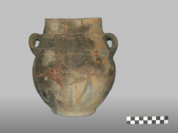 Anfora bi-ansata con corpo ovoide, alquanto irregolare, base piatta, gola e orlo diritti, prodotta con ceramica d'impasto bruno-giallastro, mediamente depurata con inclusi litici e micacei. Sulla spalla, alla base della gola si espandono due cordoni plastici come a formare la base delle due anse a nastro contrapposte di fattura piuttosto grossolana. Le superfici esterne sembrano ben ingubbiate. A metà dell'altezza del corpo è possibile notare una leggera carenatura poco marcata.