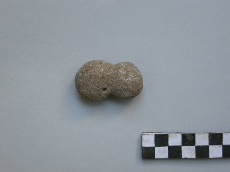 Piccolo ciottolo di arenaria grigio-rosata, di forma ovale con le estremità arrotondate e con una scanlatura mediana larga circa cm 1 circa ben pronunciata e con i bordi marcati. Le superfici sono lisce e non presentano tracce di usura, probabilmente si tratta di un martello litico.