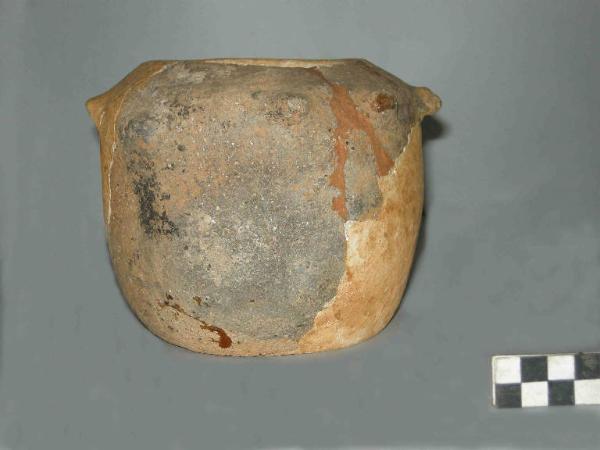 5 frammenti prodotti in ceramica d'impasto granulosa color giallo-ocra, con inclusi micacei, pertinenti a vaso di forma pressochè cilindrica, con base piatta, rientrante sia verso il piede che verso la bocca. Presenta, a circa 3 cm dalla bocca, 4 tubercoli plastici di forma conica irregolarmente distanziati tra di loro.