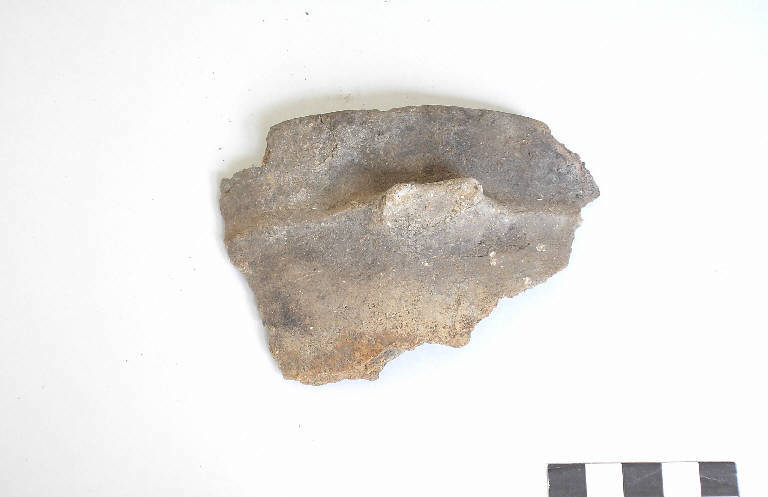 Frammento di orlo e parete ansa a presa, pertinente a capeduncola, prodotta con ceramica d'impasto color grigio, finemente depurata con piccoli inclusi micacei. Le superfici sono lisciate e lucidate. Presenta orlo di forma arrotondata, esoverso, parete distinta concava decorata con 6 solcature orizzontali e parallele e vasca a calotta.