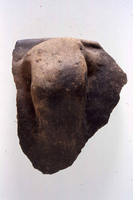 Frammento di parete con ansa, prodotto con ceramica d'impasto grossolana, finemente ingubbiata, pertinente a .... Presenta un'ansa a presa