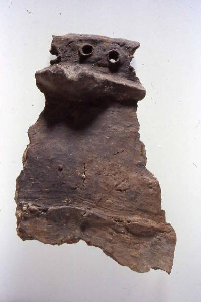 Frammento di vaso con orlo multiforato, prodotto con ceramica d'impasto grossolana. Presenta una decorazione a cordoni plastici orizzontali distanti tra di loro 8,6 cm circa. Sul primo cordone, che dista dall'orlo circa 3 cm, è innestata un'ansa a presa.