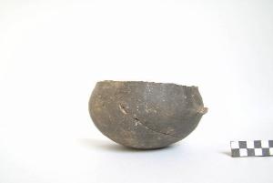 Scodella mono-ansata a corpo emisferico, prodotto con ceramica d'impasto mediamente depurata con inclusi litici e micacei, color grigio scuro. Le superfici sono lisciate. Presenta orlo di forma arrotondata obliquo verso l'interno e fondo concavo. Se ne conserva circa metà con gli attacchi dell'ansa.