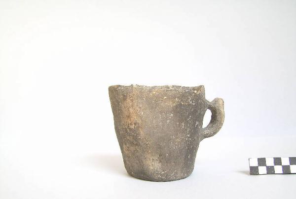 Bicchiere mono-ansato, prodotto con ceramica d'impasto grossolana, color grigio, finemente ingubbiata, fondo leggermente concavo e pareti leggermente convesse. L'ansa a gomito con ponticello leggermente obliquo si innesta a circa 1,8 cm dall'orlo per giungere nella parte medina del corpo.