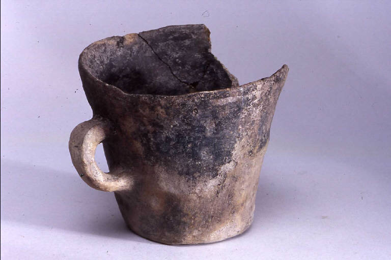 Boccale a corpo tronco-conico monoansato, prodotto con ceramica d'impasto mediamente depurata con inclusi litici e micacei, con orlo arrotondato, lati irregolarmente rettilinei e fondo piano. L'ansa è di tipo a orecchio ed è impostata a metà altezza.