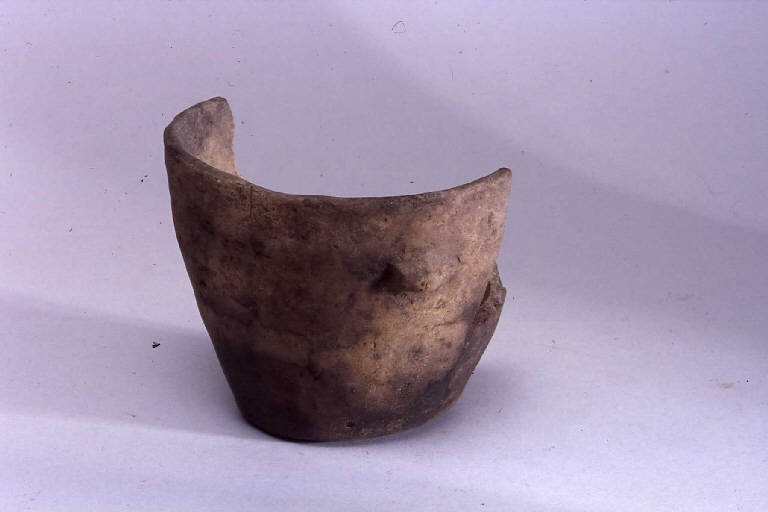 Tazza a corpo tronco-conico, prodotta con ceramica d'impasto finemente depurata e superficie lisciata, color marrone, con orlo piatto, lati rettilinei lievemente convessi verso l'orlo e fondo piano. Poco distante dall'orlo si nota una bugnetta.