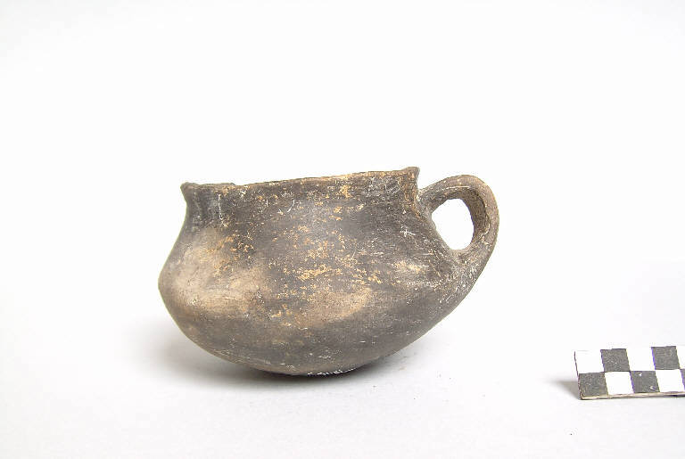 Boccale a corpo lievemte articolato monoansato, prodotto con ceramica d'impasto mediamente depurata con inclusi litici e micacei e superficie lisciata, color grigio scuro, avente orlo arrotondato, lievemete esoverso, profilo sinuoso e fondo convesso con il diametro di base inferiore al diametro massimo. L'ansa, di tipo a orecchio, è impostata po sotto l'orlo.