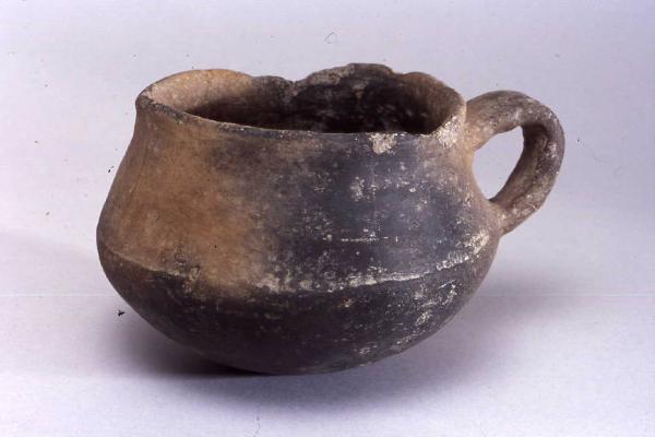 Tazza a corpo con risegha monoansata,prodotta con ceramica d'impasto finemente depurata con minuti inclusi micacei, color grigio, e superficie lisciata, avente orlo di forma arrotondata, assottigliato, lievemente esoverso, parete distinta rettilinea rastremata verso l'orlo, vasca a calotta e fondo convesso. L'ansa, di tipo ad orecchio è impostata sotto l'orlo. Il pezzo presenta lacune all'orlo.