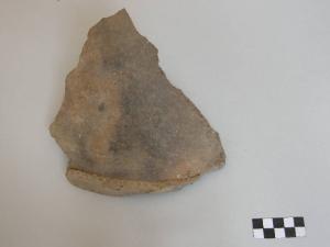 Frammento di parete, pertinente a vaso biconico, prodotto con ceramica d'impasto mediamente depurata con minuti inclusi micacei, color grigio scuro, e superficie lisciata. Presenta un cordone plastico inciso a tacchette.