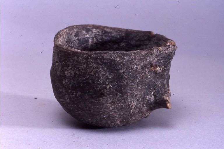 Tazzina a corpo globoso monoansata, prodotta con ceramica d'impasto mediamente depurata con inclusi litici e micacei, color grigio, avente orlo arrotondato, profilo emisferico e fondo piano. Si notano ancora gli attacchi di un ansa che si innestava sull'orlo.