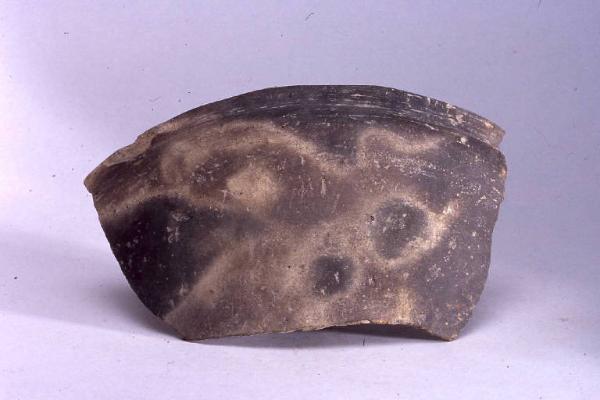 Frammento di orlo e parete, pertinente a scodella con corpo a calotta, prodotta con ceramica d'impasto finemente depurata con minuti inclusi micacei, color grigio, e superficie lisciata, avente orlo arrotondato, ingrossato, esoverso.