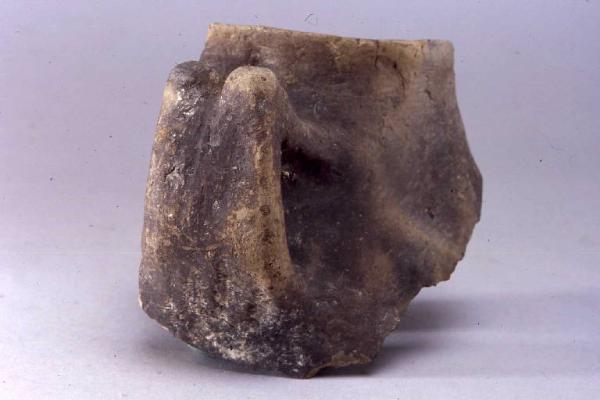 Frammento di orlo e parete, pertinente a boccale, a corpo carenato, prodotto con ceramica d'impasto mediamente depurata con inclusi litici e micacei, color grigio-marrone, avente orlo arrotondato, lievemente esoverso, parete distinta rettilinea. L'ansa, del tipo ad orecchio, ha le appendici a bottone.