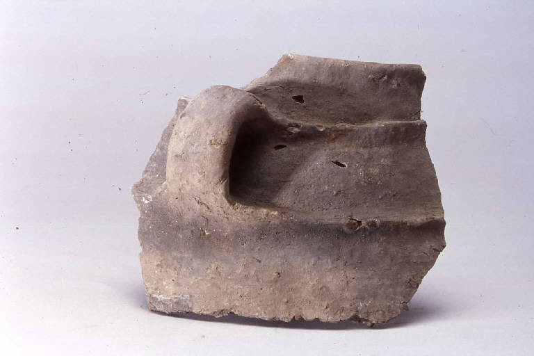 Frammento di orlo e parete con ansa, pertinente a vaso, prodotto con ceramica d'impasto mediamente depurata con inclusi litici e micacei, color grigio chiaro, avente orlo arrotondato. L'ansa, del tipo nastriforme ad anello, è impostata sotto l'orlo su due cordoni plastici paralleli..