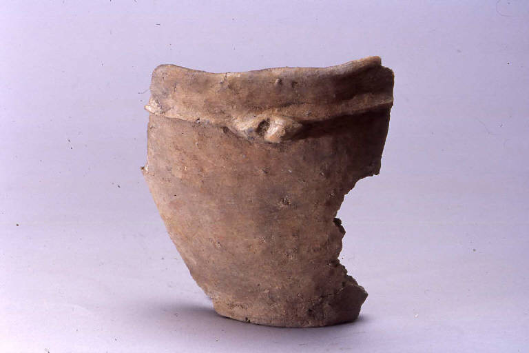 Tazza a corpo tronco-conico, prodotta con ceramica d'impasto mediamente depurata con inclusi litici e micacei, color grigio-marrone, avente orlo arrotondato e fondo piano. Presa a due bottoni, impostata su cordone plastico decorativo.