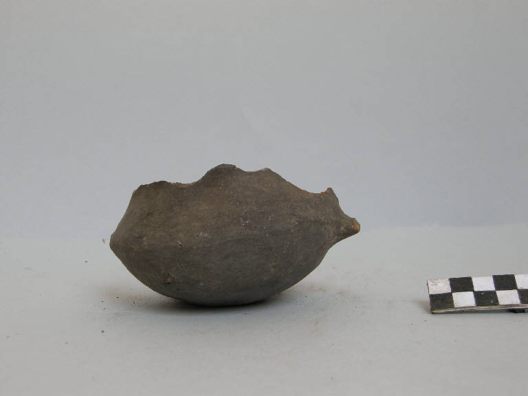 Frammento di parete, pertinente a ciotoloa carenata, prodotta con ceramica d'impasto mediamente depurata con inclusi litici e micacei, color grigio, avente parete distinta lievemente concava, vasca a calotta e fondo piano. Rimane l' attacco dell'ansa.