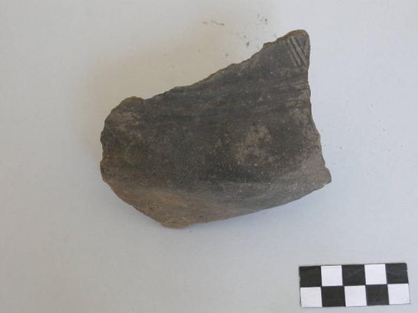 Frammento di parete con bugna, pertinente a vaso a corpo biconico, prodotto con ceramica d'impasto grossolana con inclusi litici e micacei, color grigio, e superficie lisciata. Presenta tre diversi motivi decorativi: il primo è costituito da due impressioni circolari; il secondo, da 3 lievi solcature orizzontali; l'ultimo, sembra un motivo triangolare a fasci di 3 solcature.