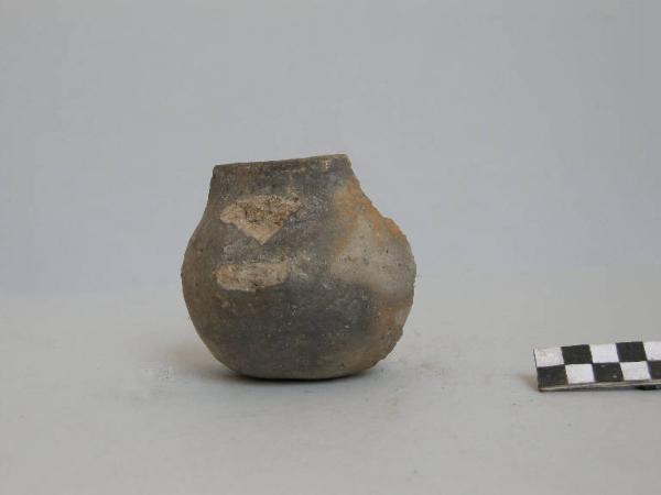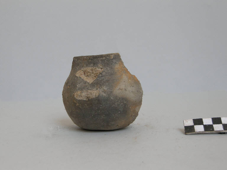 Boccale a corpo globoso, prodotto con ceramica d'impasto mediamente depurata con inclusi litici e micacei, color grigio, avente orlo arrotondato, lievemente esoverso e profilo sinuoso. Rimengono gli attacchi dell'ansa.
