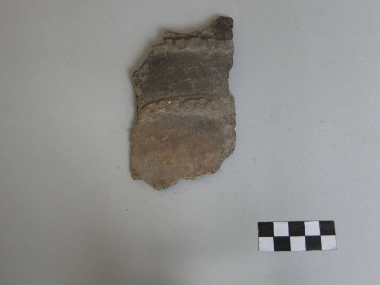 Frammento di parete, pertinente a vaso, prodotto con ceramica d'impasto mediamente depurata con inclusi litici e micacei, color grigio. Presenta una decorazione costituita da 2 cordoni plastici su cui sono incise delle coppelle.