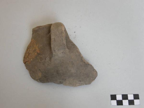 Scodella a corpo emisferico, prodotta con ceramica d'impasto mediamente depurata con minuti inclusi micacei, color grigio, superficie lisciata, avente orlo arrotondato, assottigliato, lievemente esoverso. L'ansa, del tipo a gomito, è impostata sotto l'orlo.