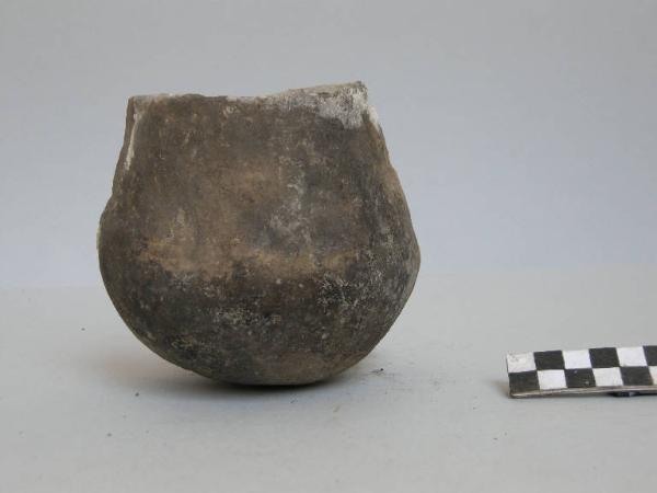 Boccale a corpo carenato, prodotto con ceramica d'impasto mediamente depurata con inclusi litici e micacei, color grigio, avente orlo arrotondato, assottigliato, parete distinta rettilineae vasca a calotta.