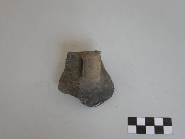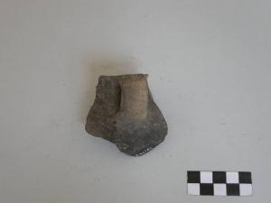 Frammento di orlo e parete con ansa, pertinente a boccaletto carenato, prodotto con ceramica d'impasto finemente depurata con minuti inclusi micacei, color arancio, avente orlo arrotondato, lievemente esoverso, parete distinta lievemente convessa e vasca a calotta. L'ansa, del tipo nastriforme ad anello, è impostata sull'orlo.