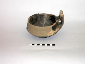 Tazza-attingitoio carenata con ansa a corna tronche sopraelevata sull'orlo.