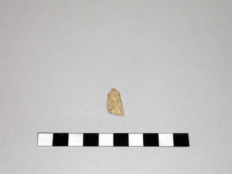 Lamella in selce color grigio con cortice sulla faccia dorsale.