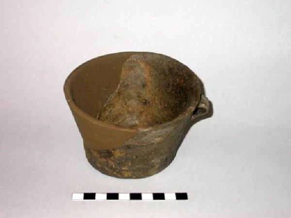 Boccale troncoconico con piccola ansa ad anello.
