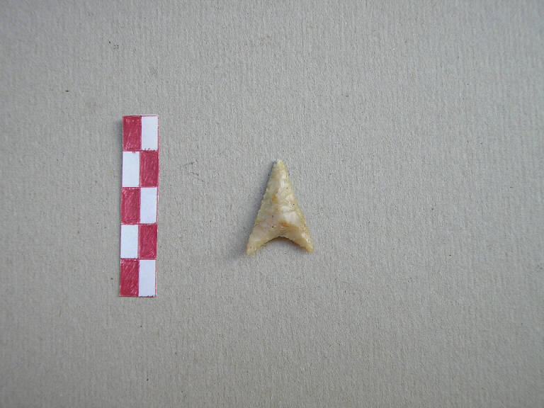 Cuspide di freccia a base concava con ritocco piatto coprente bifacciale e margine lievemente denticolati.