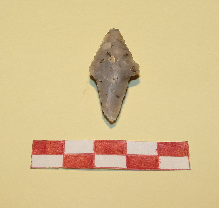 Cuspide di freccia, in selce grigio-beige, con lungo peduncolo, avente forma triangolare e alette.