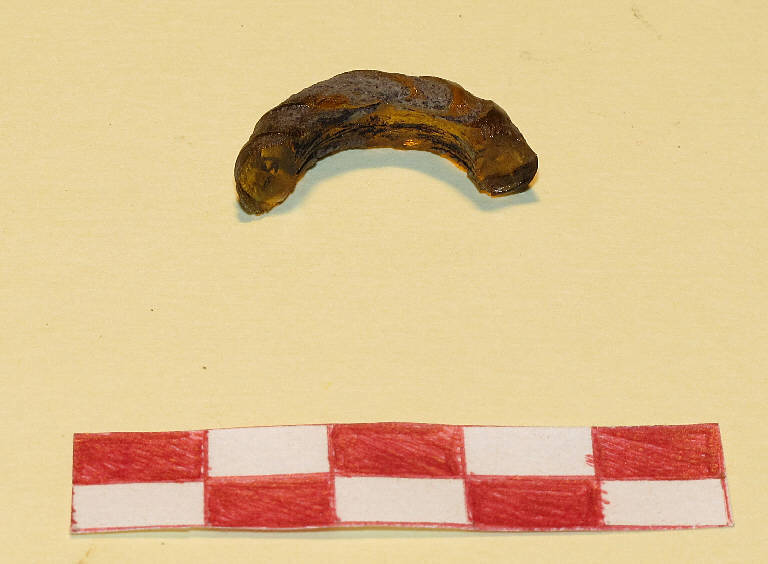 Frammento di anello in vetro color ambra decorato con costolature e scanalature.